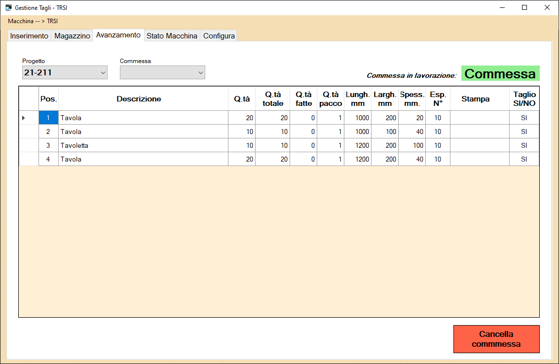 – Stato Avanzamento viene eseguito richiamando e confrontando i file che la macchina registra in sequenza per determinare (e visualizzare per controllo) le quantità fatte rispetto a quelle da fare.