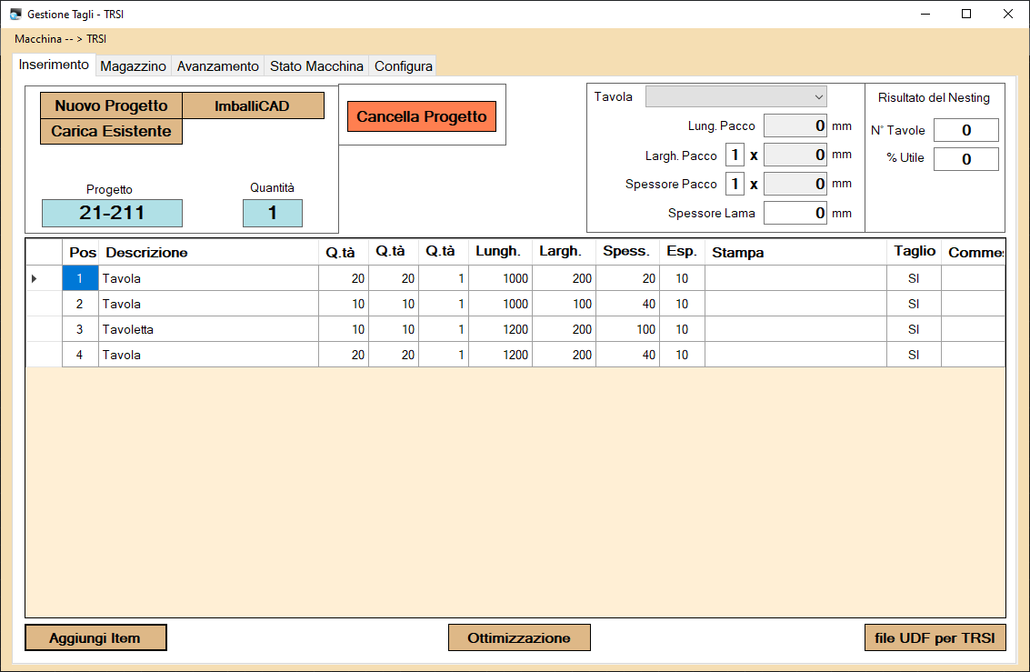 – INSERIMENTO LIBERO sulla maschera. Dalla maschera di interfaccia è possibile inserire liberamente in modo guidato i pezzi da tagliare con le dimensioni e numero.