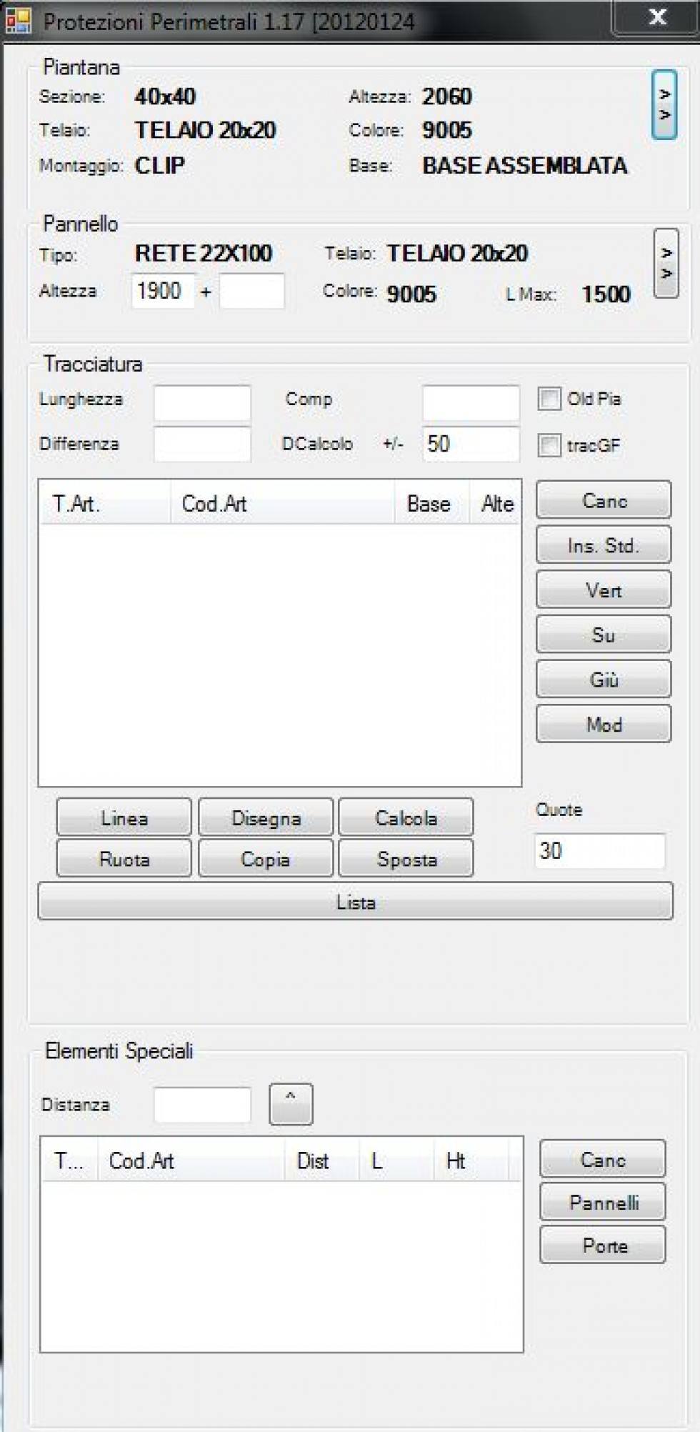 Il software mette a disposizione dell’operatore strumenti software di disegno per progettare recinzioni modulari composte da pannelli, piantane, porte ed altri elementi accessori quali viterie, staffe e serrature selezionabili da una libreria.